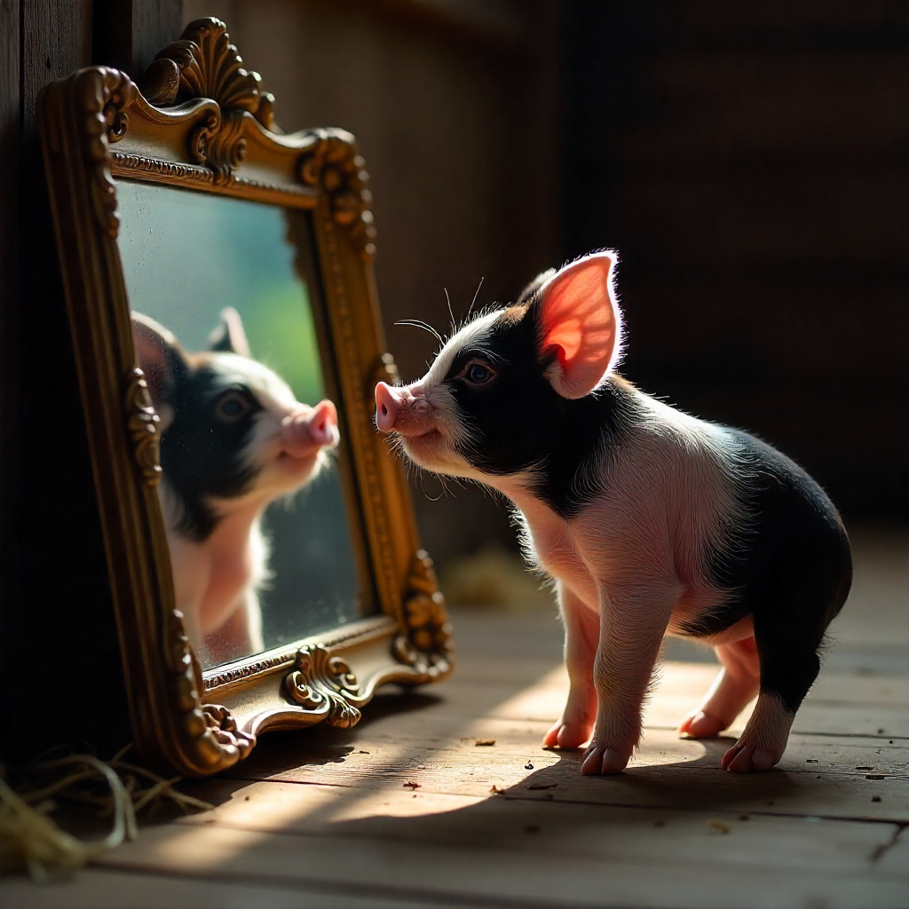 Свиньи также обладают чувством собственного достоинства и индивидуальностью. Они не только видят себя в зеркале так же, как приматы, но и понимают: то, что они видят — это отражение реальности. Исследователи провели эксперимент: они прятали еду так, что свиньи не могли ни почувствовать ее запах, ни найти ее иначе, как через зеркало. Но что самое удивительное: животные не искали еду за зеркалом. Семь из восьми подопытных хрюшек добрались до еды менее, чем за 30 секунд.