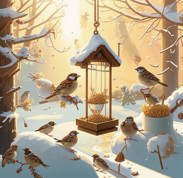 Птицам нужна энергия, чтобы согреться и поддерживать свои жизненно важные функции, поэтому предпочтение следует отдавать продуктам, богатым жирами, таким как жировые шарики (продаются в зоомагазинах и на маркетплейсах). Подойдут смеси семян для птиц, а также кусочки фруктов без косточек (яблоки, груши), сырные корочки, вареный рис и т.д. Главное, чтобы еда была не соленая.