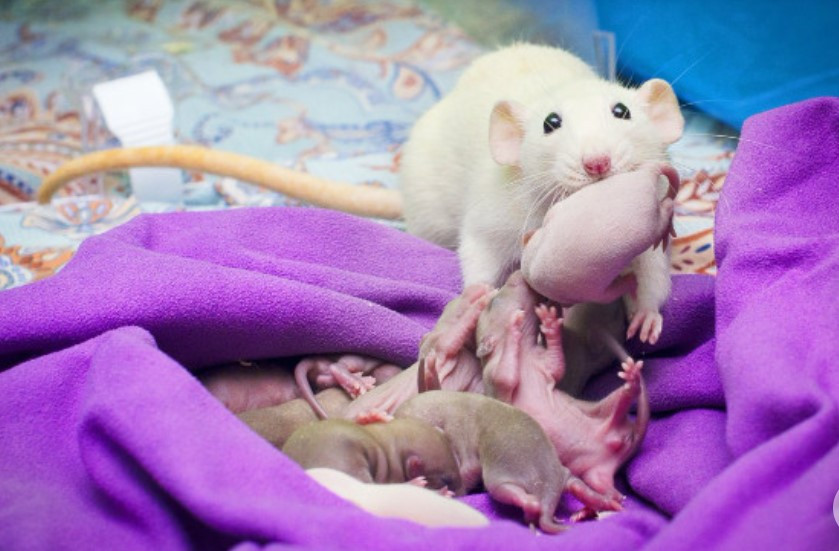 Крысята рождаются голыми, слепыми, крайне чувствительными к перепадам температур, поэтому им необходимо тепло мамы-крысы и братьев/сестер. Если в течение 24 часов появятся мертворожденные детеныши, самка их съест или перенесет в угол клетки. В этом случае просто их уберите.