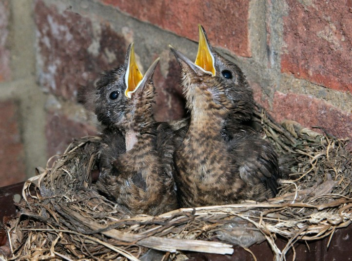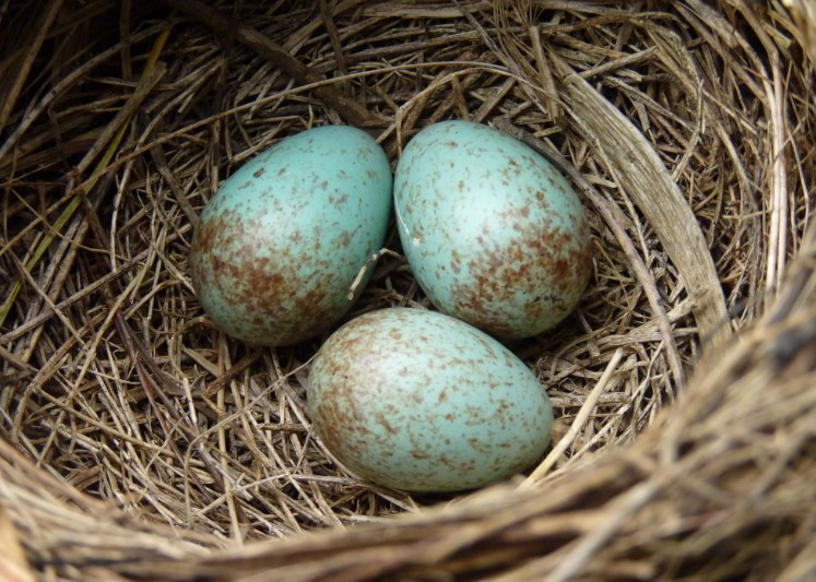 ✔️В гнезде черного дрозда обычно от трех до шести бирюзовых яиц с пятнами ржавого цвета. Высиживает яйца самка. Птенцы появляются на свет через две недели и тогда самец присоединяется к их кормлению.