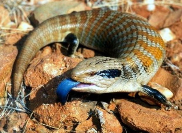 У синеязыкого сцинка окраска не имеет ничего общего с защитным меланином млекопитающих. Его язык, лишенный яда, — это оружие устрашения: ярко-синий оттенок сразу бросается в глаза и резко контрастирует с серо-коричневой кожей тела. Когда сцинк чувствует угрозу, он резко открывает пасть и направляет свой ярко-синий, почти флуоресцентный язык на хищника. Такого эффекта неожиданности часто бывает достаточно, чтобы отпугнуть нападающего.
