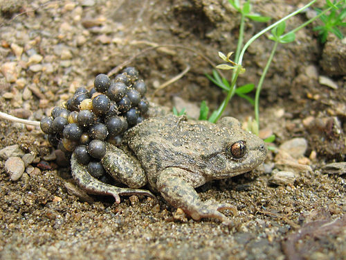Самцы жабы-акушерки берут отложенные самками яйцевые нити и носят их на задних лапах до тех пор, пока головастики не вылупятся. В этом смысле они играют важную роль повитух.